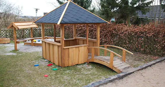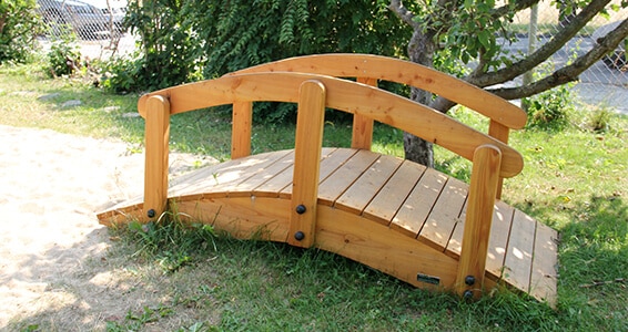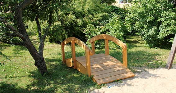 En buet bro kan være et motorisk udfordrende ‘redskab’ for de mindste eller adgangsvej ind i et legeområde f.eks. sandkassen.
