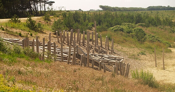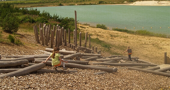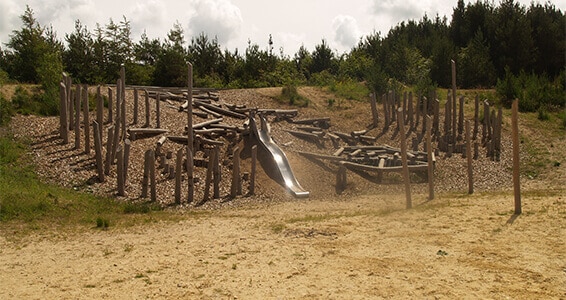 Balancelandskab ned ad stejl skrænt ved grusgravsø i Sdr. Plantage ved Varde