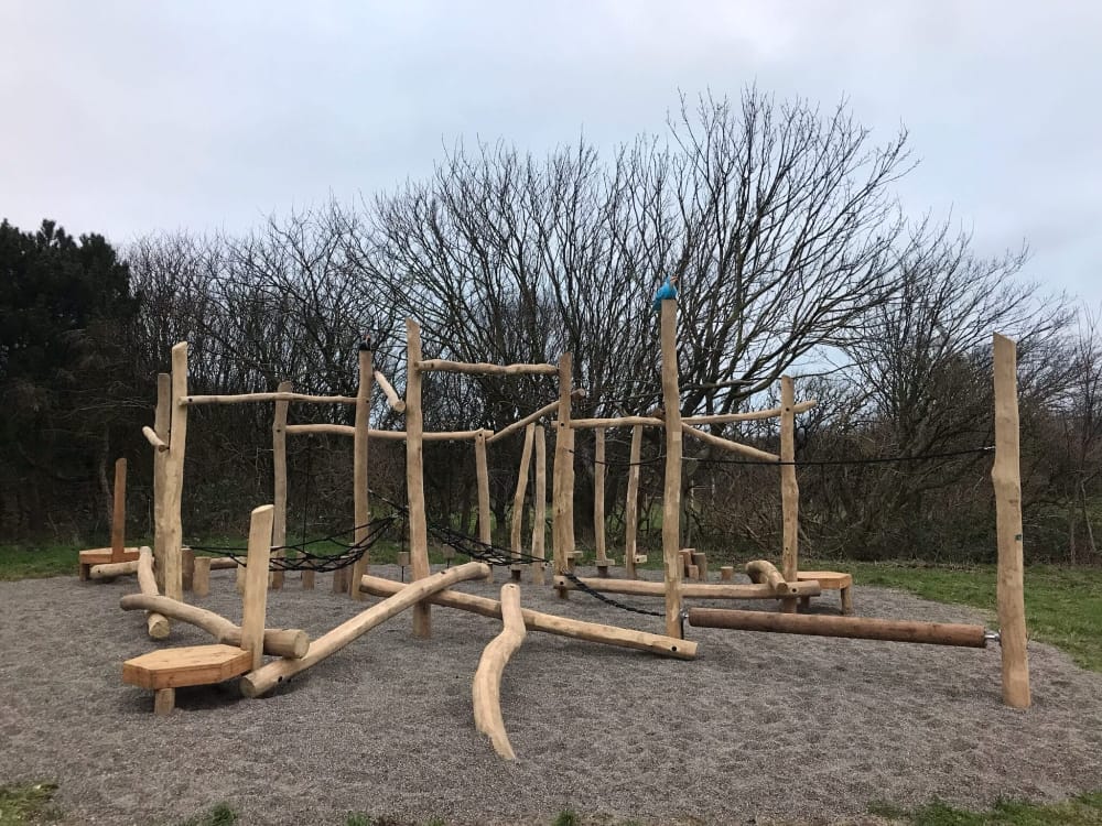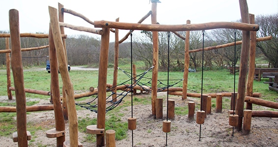 Udført i robiniestolper i forskellige tykkelser, kombineret med rullende stamme, balancebomme, net og balancedele.