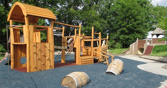 Tovbro, klatrenet, klatrevæg, rutschebane og bevægelige trin som opgang.