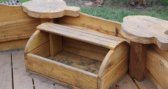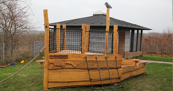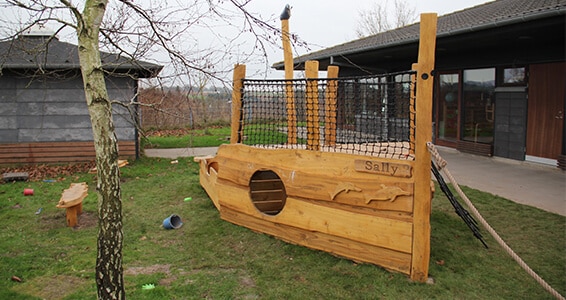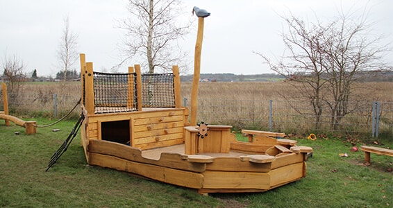 Piratskib i mellemstørrelse med klatre- og kravlemuligheder, hule i stævnen, og kaptajnens skatkiste.