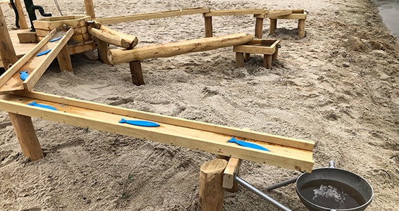 Bygget med pumpestation, brønd, render og sand/vandkran.