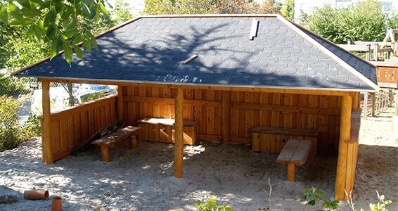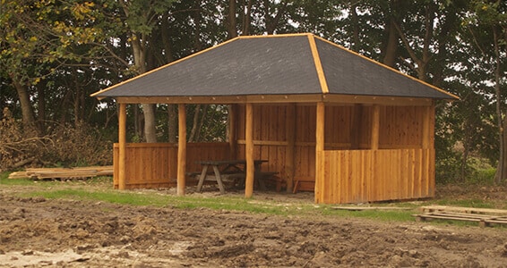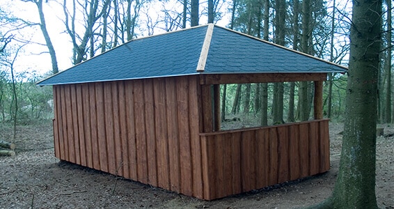 Bygges med stolper i robinie og spær og remme i kantskåret tømmer.
